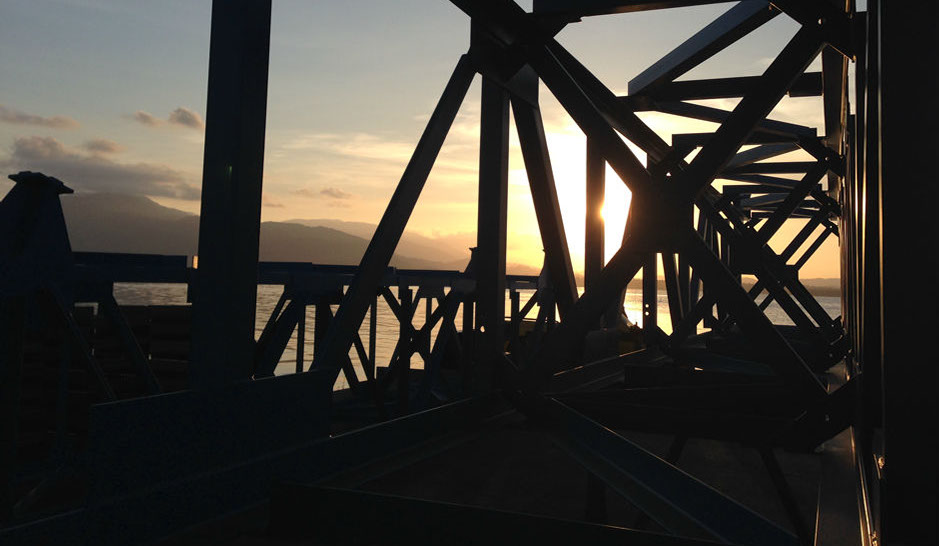 Atardecer en la Bahía de Amatique, Torre de Conveyor, Planta de montaje Dogomar, Puerto Barrios, Izabal.